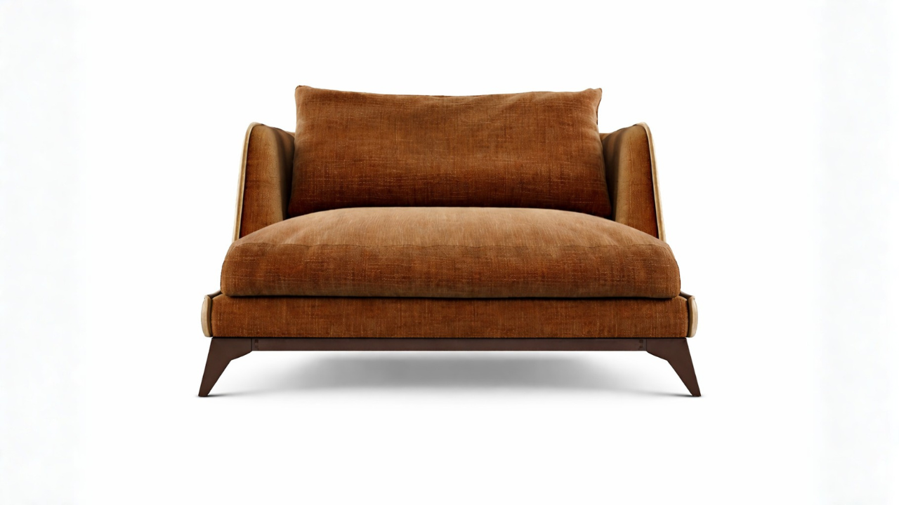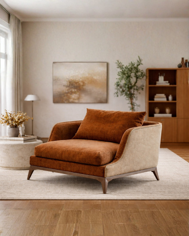 The Madeza Accent Chair features warm caramel upholstery with soft curves and sleek wooden legs. Designed for both comfort and elegance, its inviting form adds a cozy yet modern touch to any living space, making it a stylish accent piece that blends effortlessly with contemporary interiors.