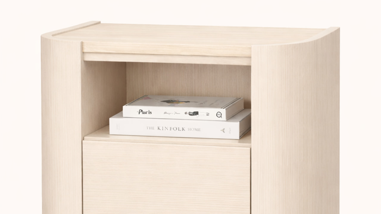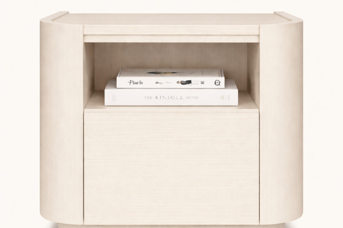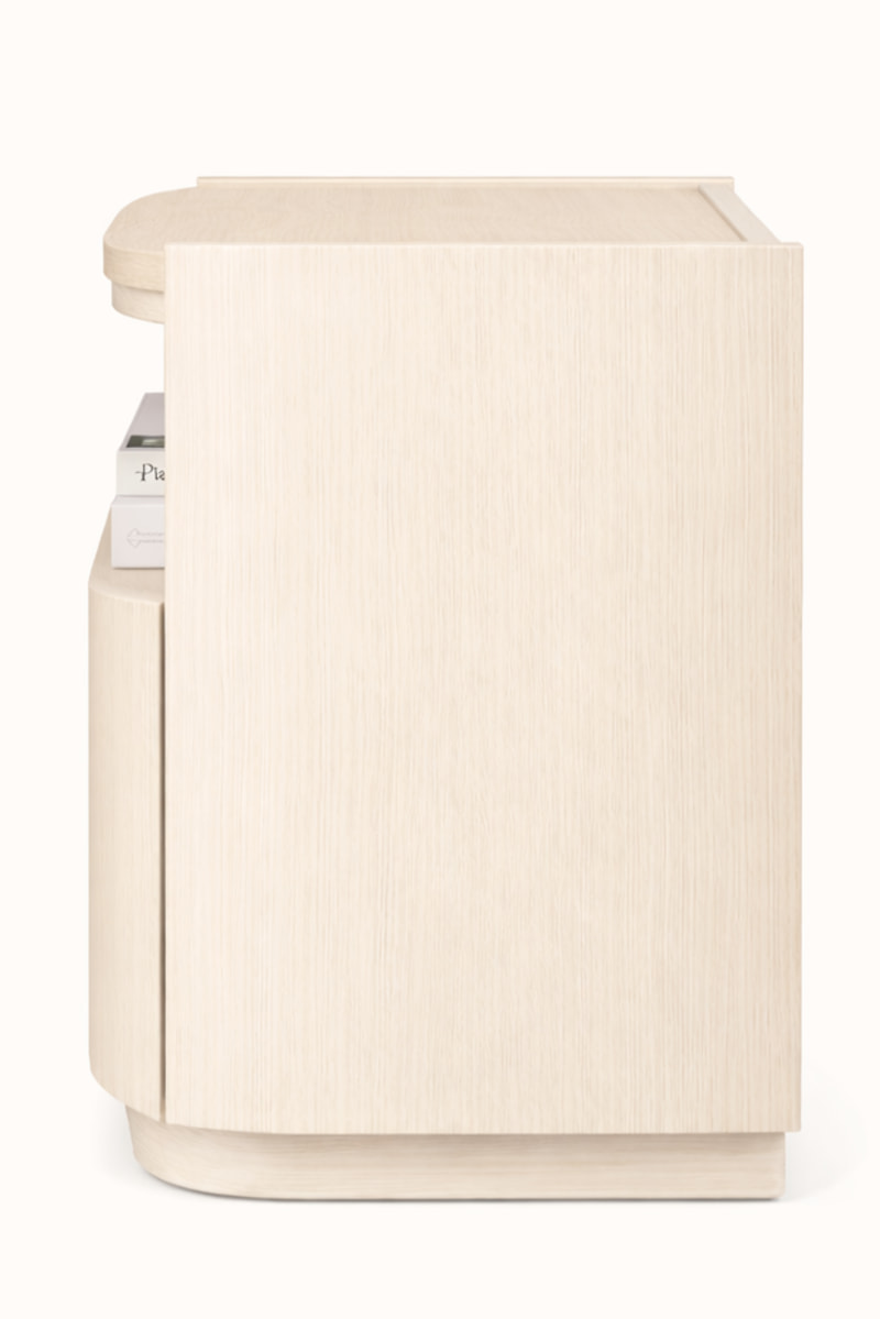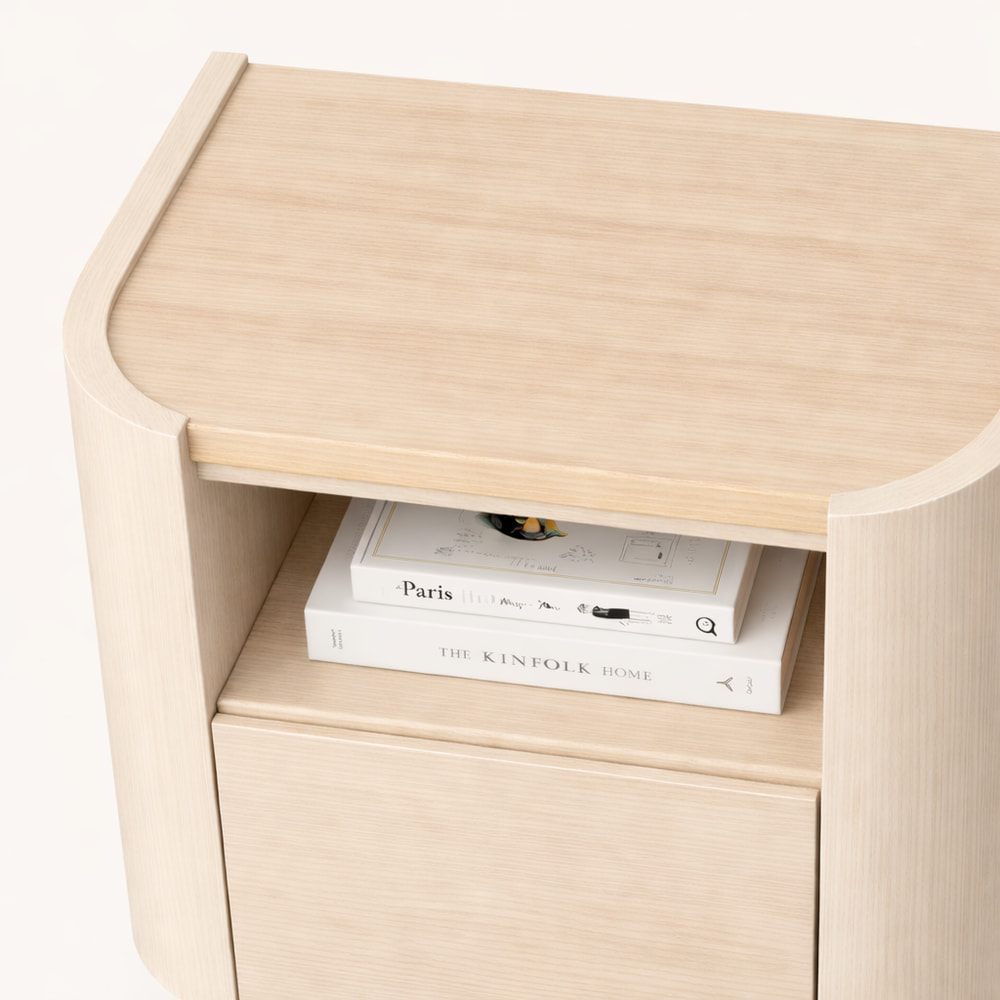 Bella Bedside Table – Features soft curved edges and a refined minimalist silhouette, bringing a calm and contemporary touch to your bedroom. Designed with an open shelf and concealed storage, it offers both elegance and practical functionality in a beautifully balanced form.