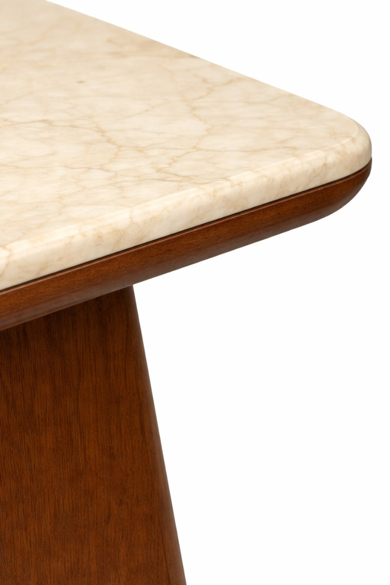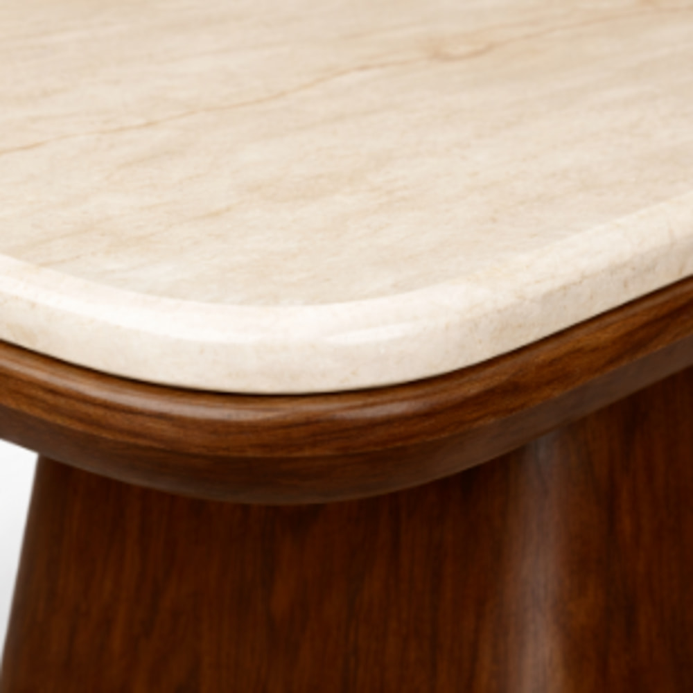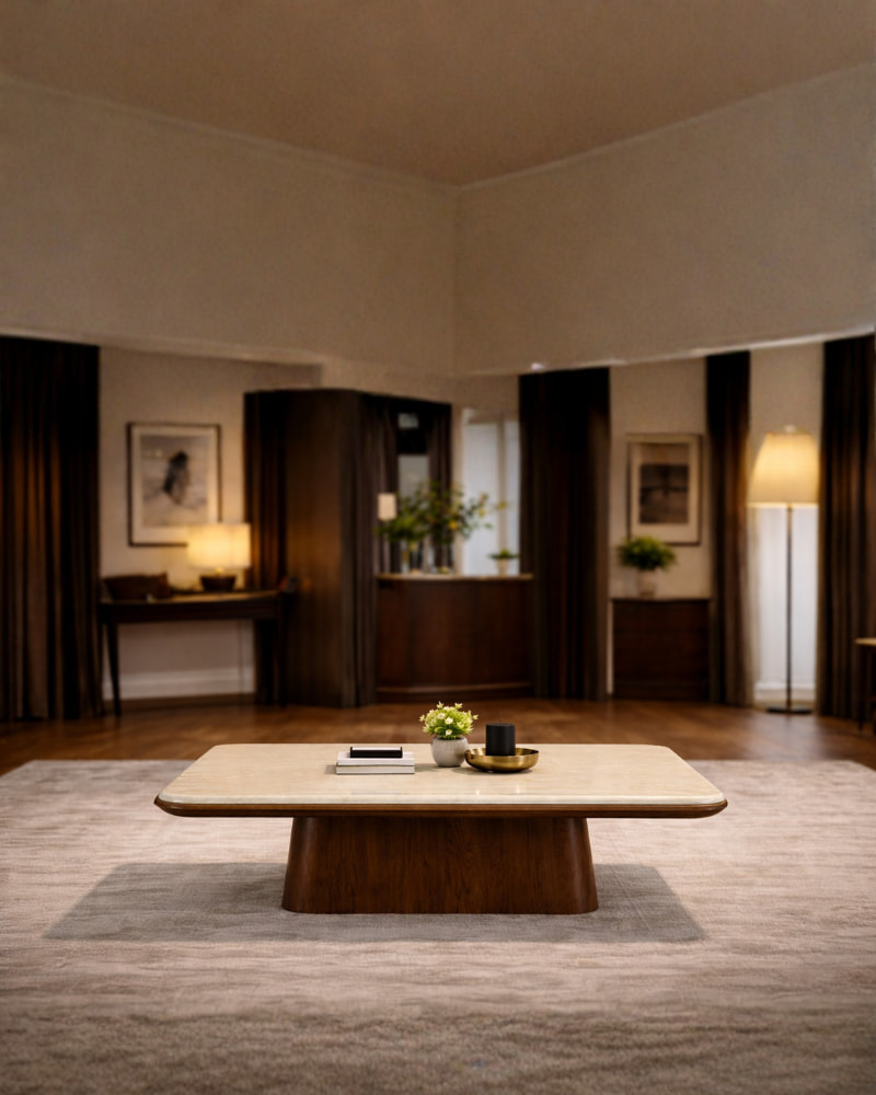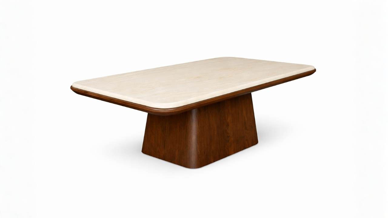 Madeza Coffee Table – A contemporary coffee table featuring a smooth light-toned top paired with a bold, sculpted wooden base for a refined and balanced look. Its clean lines and solid form create a warm, sophisticated centerpiece perfect for modern living spaces.