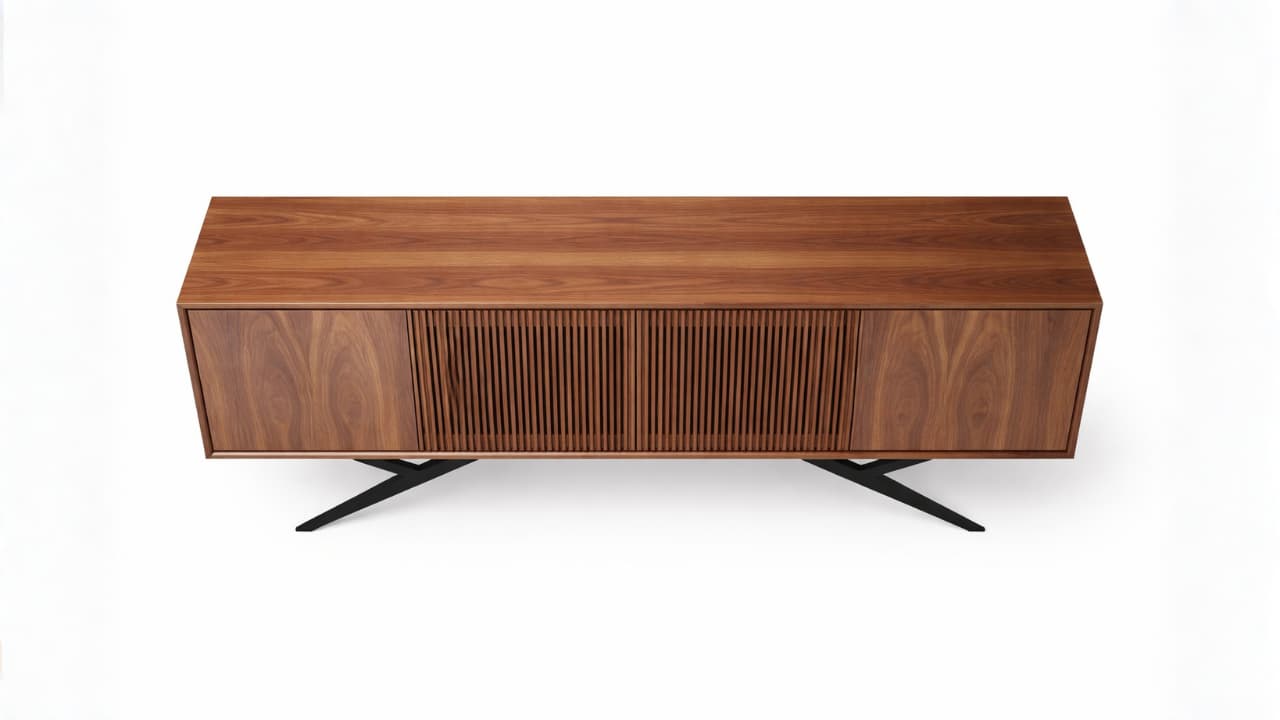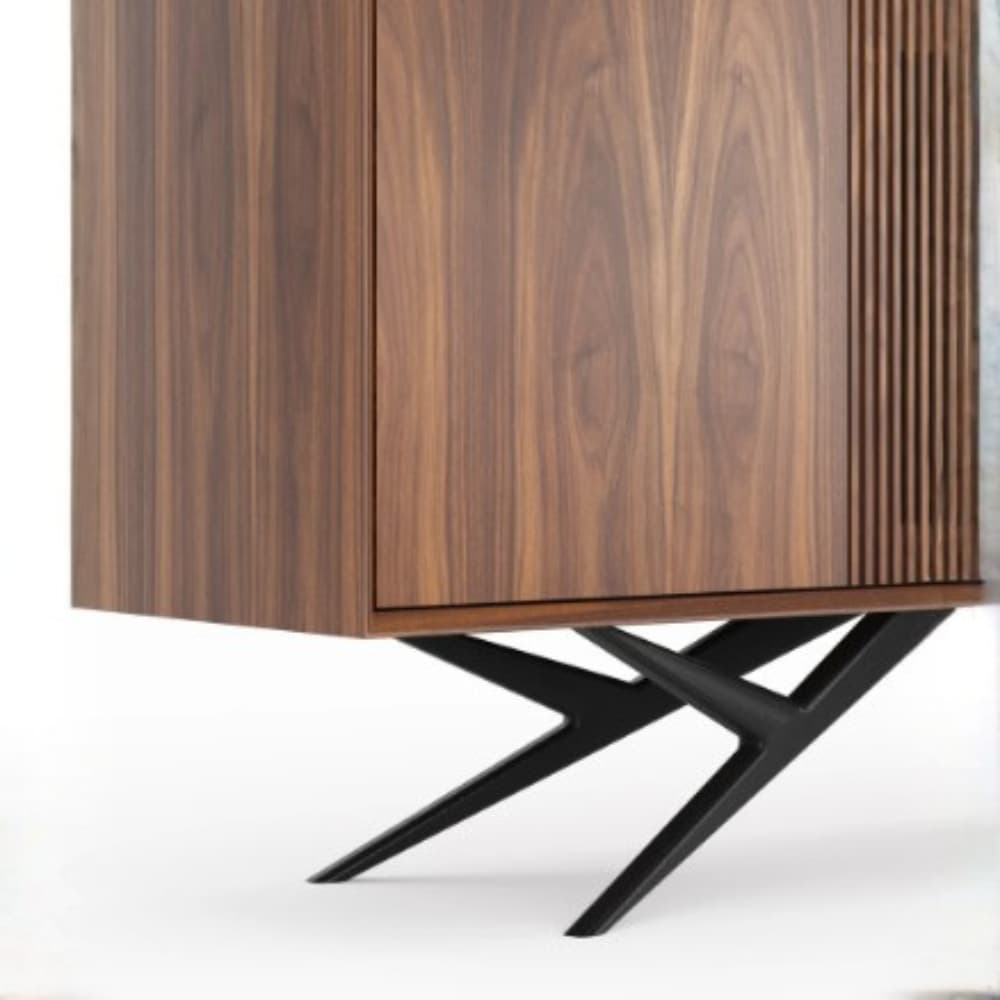 Madeza Buffet Table – Features a beautifully crafted wood finish highlighted by its refined grain patterns and elegant slatted center detail. Supported by sleek metal legs, it combines modern sophistication with practical storage, making it a striking addition to any dining or living space.
