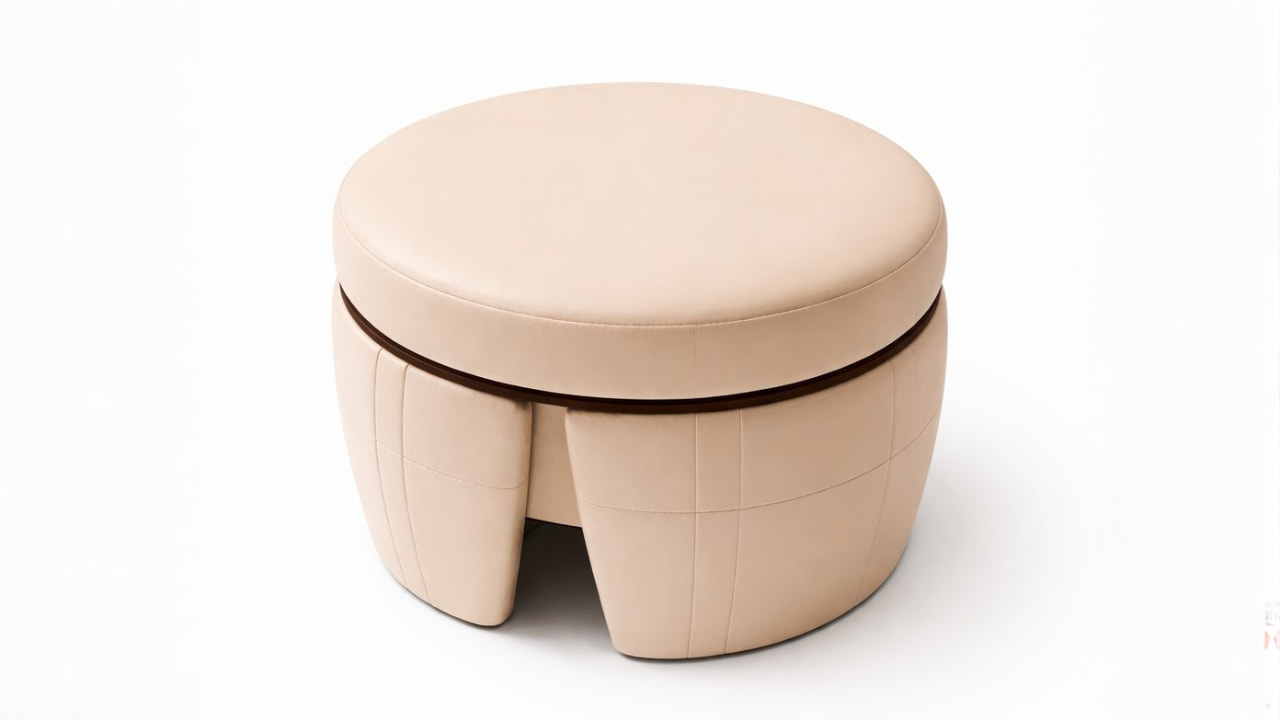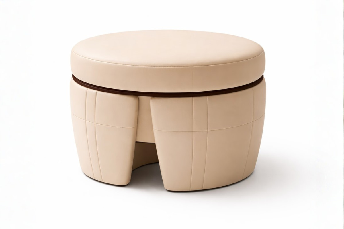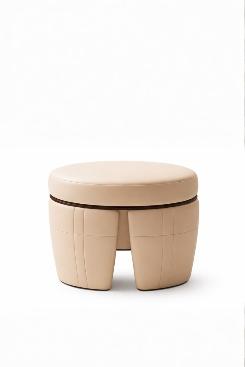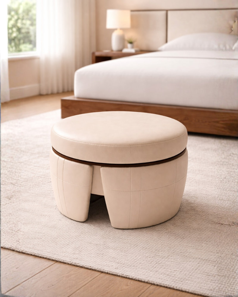 Lex Ottoman – Blends sculptural form with refined upholstery, creating a soft yet contemporary statement for any bedroom or living space. Its smooth cushioned top and subtle wooden accent detail add warmth and elegance while offering versatile functionality.
