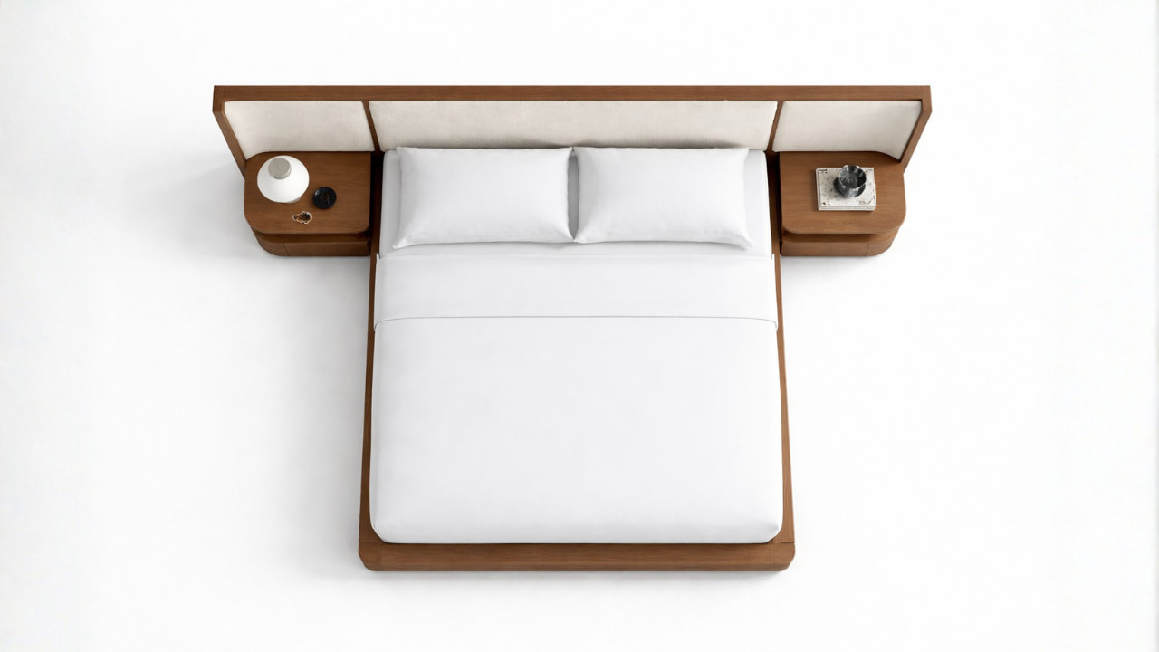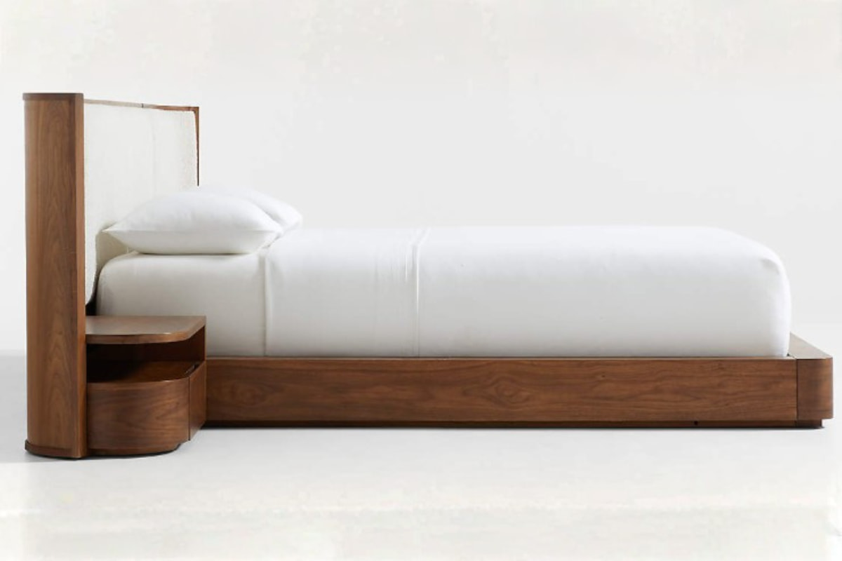 Lex Queen Bed – Showcases a refined blend of warm wood tones and softly upholstered panels, creating a balanced and sophisticated presence in any bedroom. Its clean lines and integrated side shelving offer both elegance and functionality, making it a timeless centerpiece for modern living.