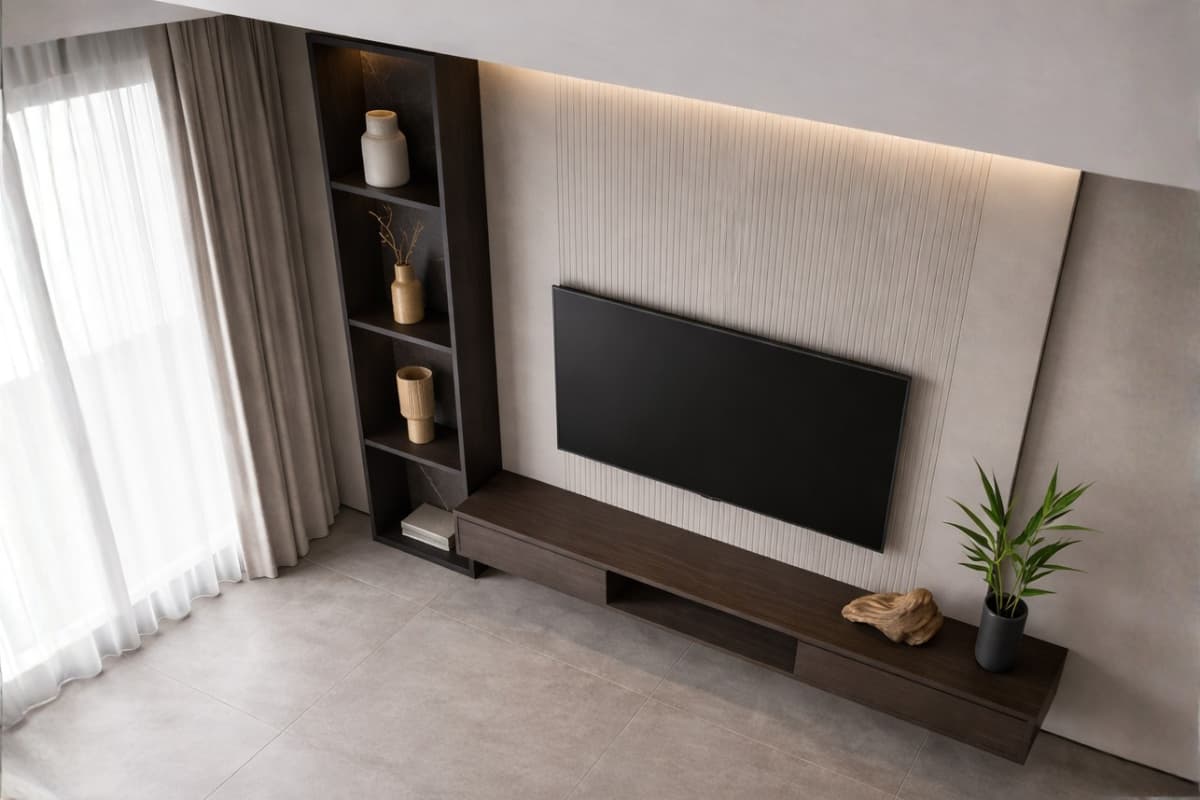 Bella TV Console – Crafted using high-quality board materials, finished in a refined wood texture that brings a warm and contemporary appeal to your living space. Its clean-lined design with a mix of concealed storage and open shelving offers practical functionality while maintaining a sleek, minimalist aesthetic.