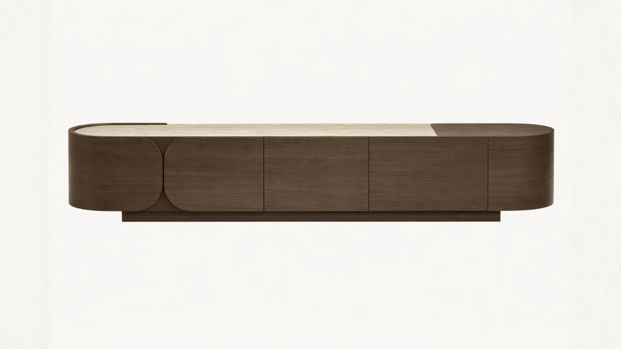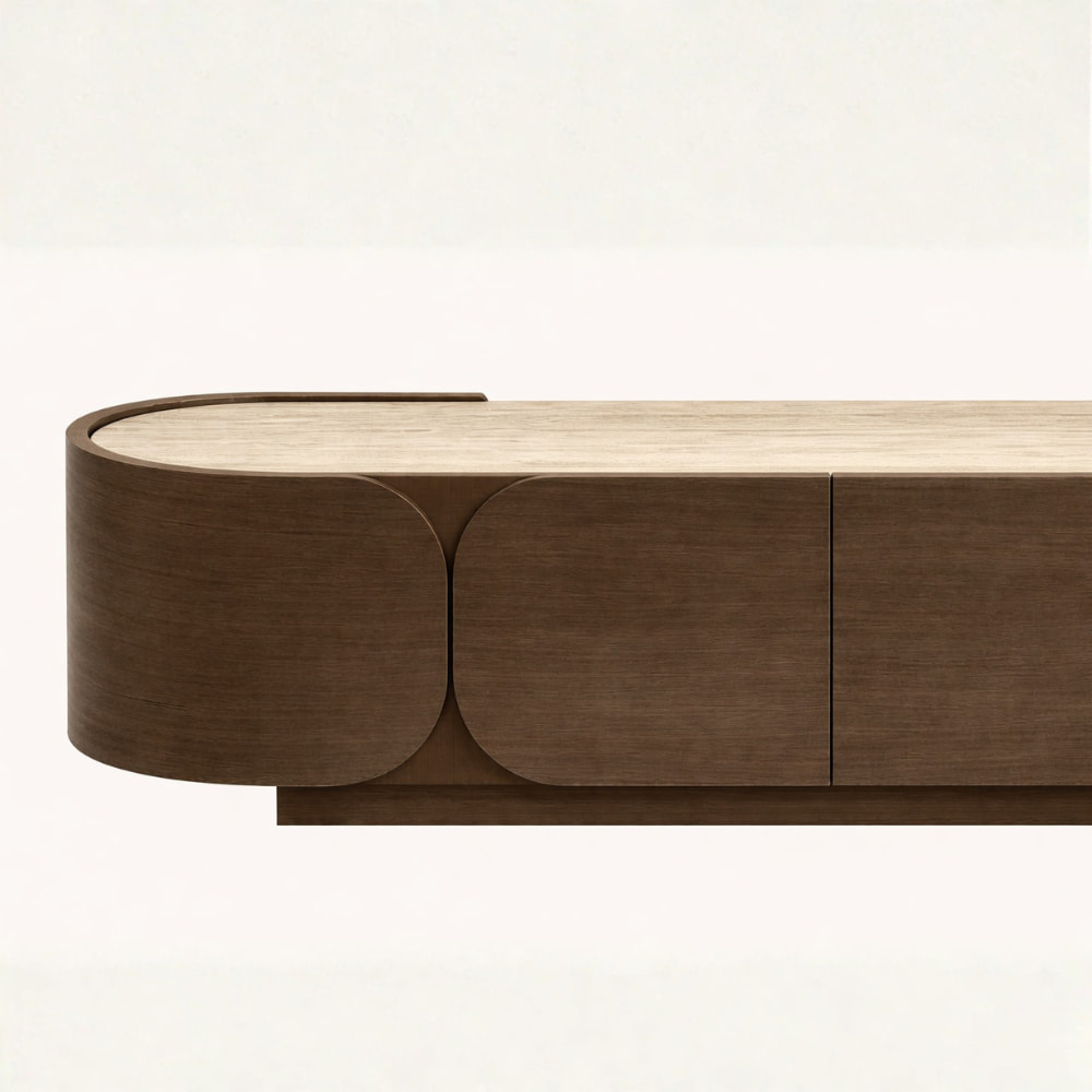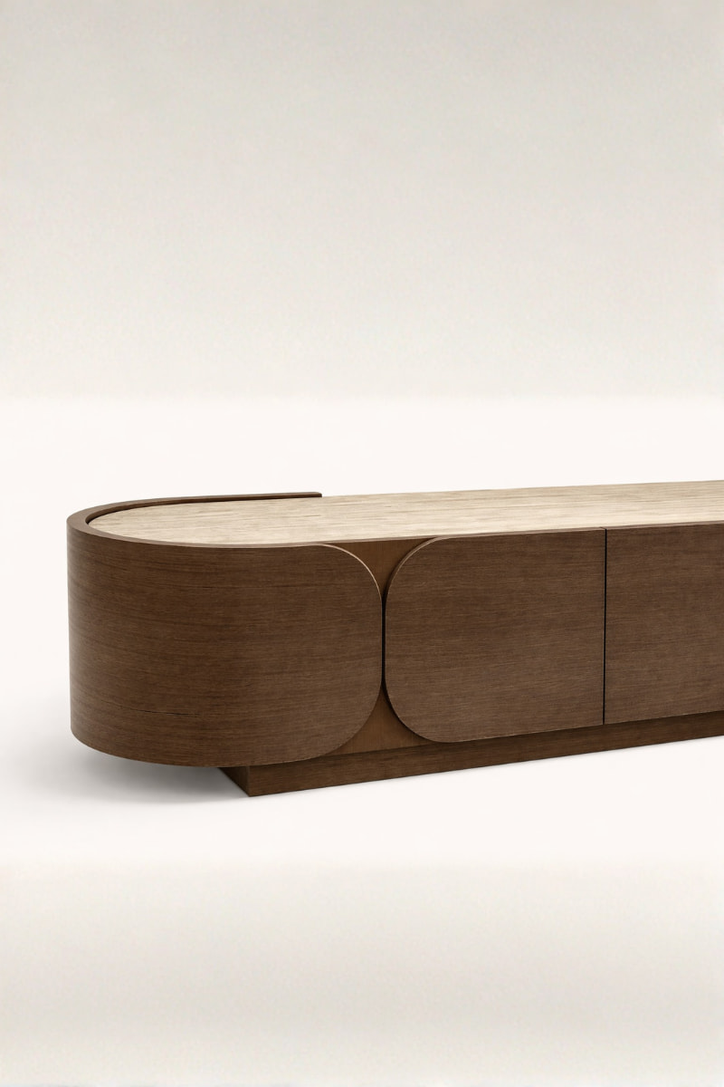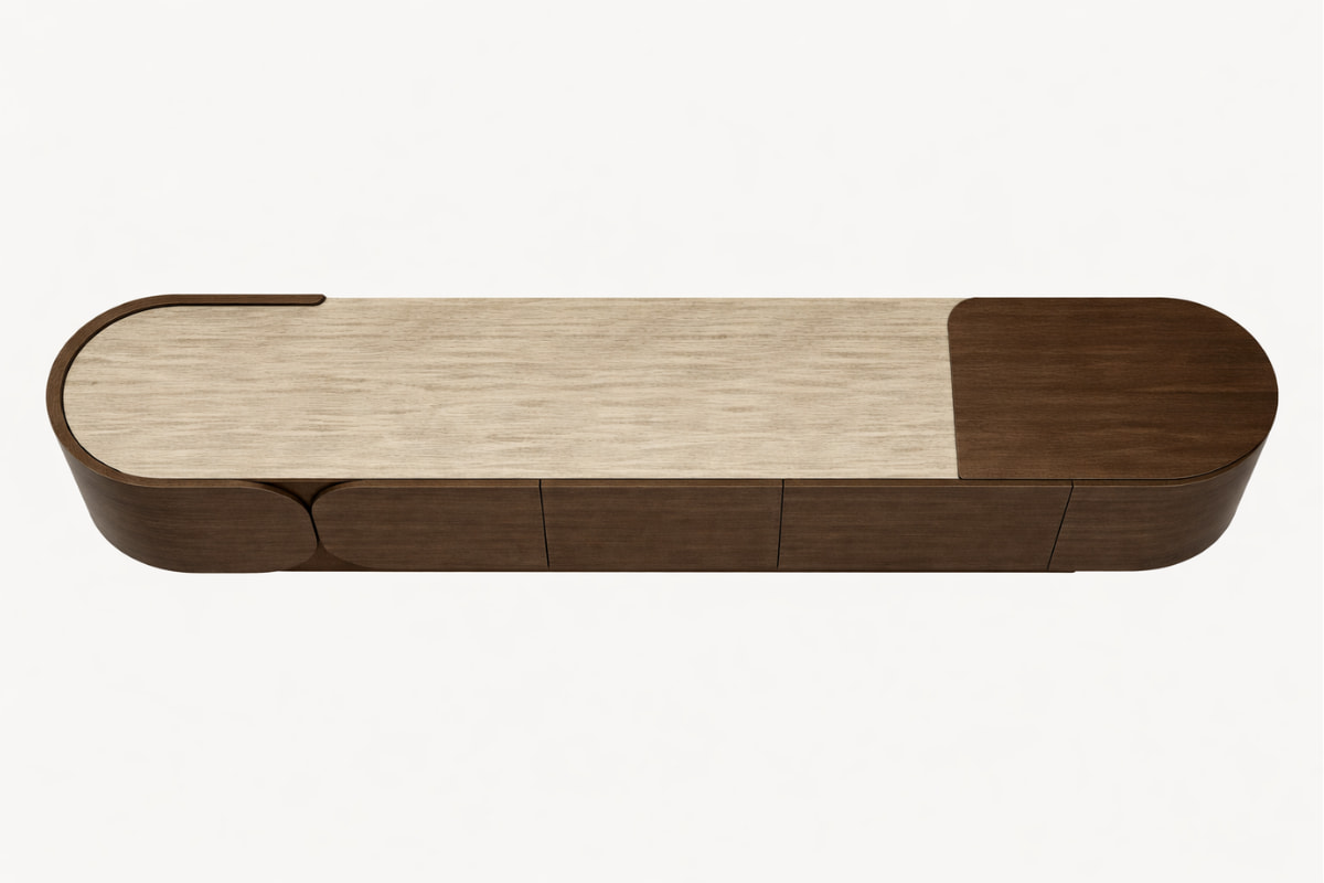 Lex TV Console – Features a sculptural low-profile design with smooth rounded edges and a striking two-tone finish. Its spacious concealed storage and modern silhouette make it a refined statement piece for contemporary living spaces.